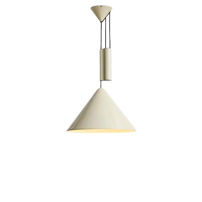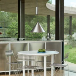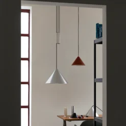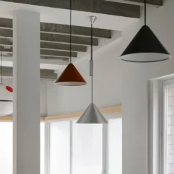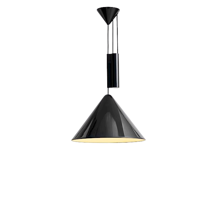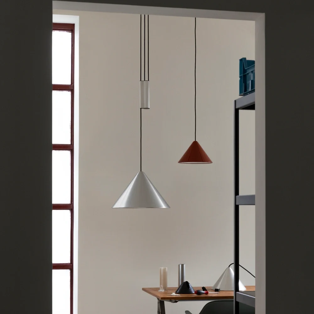Designed by Julien Renault for HAY, Compass is a series of lamps based on the classic pendant typology, unified by their distinctive conical silhouette. The angled shade is available in a classic model with fixed cord length, as well as a height-adjustable variant with counterbalanced weight that enables users to precisely position the direction and height to suit their preferences. Crafted in aluminium with different finishes and size options, Compass offers a versatile lighting solution that complements both domestic and office environments.