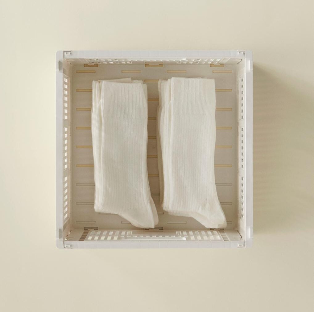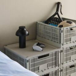 HAY’s Colour Crate is a series of handy, adaptable storage boxes with a perforated design. Made from 100% recycled post-consumer plastic, these stackable crates come in cubes, squares, and rectangles in a wide variety of colours and sizes. They can be supplemented with lids and wheels, and placed inside each other in multiple configurations, making them ideal for storage, display, and even innovative furniture items. Their multifunctionality, combined with their ability to be folded flat when not in use, makes them a versatile and space-saving storage solution.