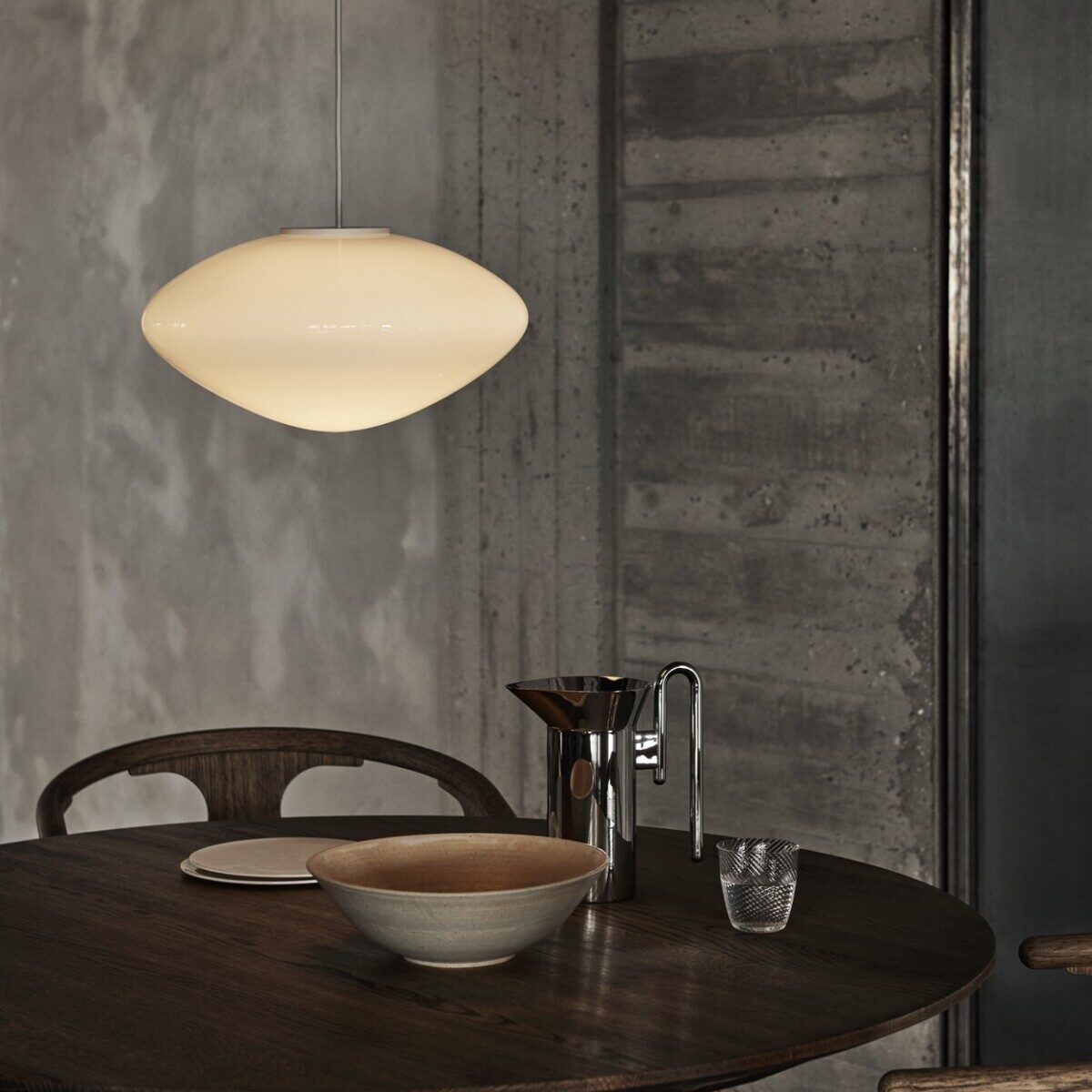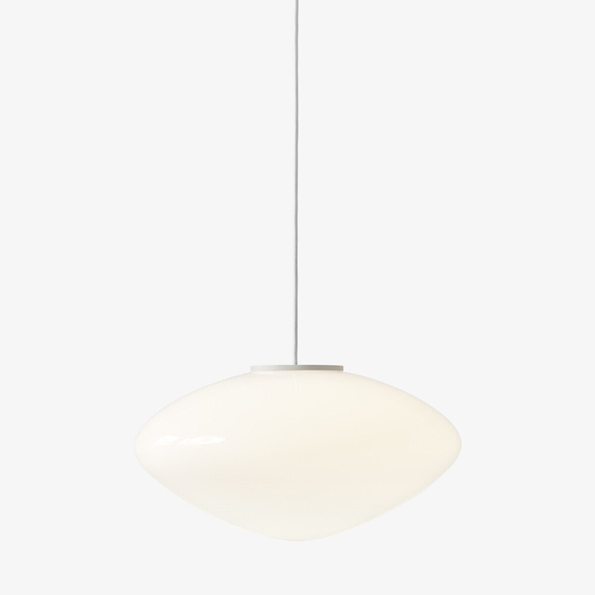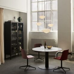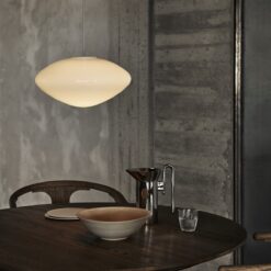 Mist is inspired by the warm, diffused light of morning sunlight shining through the haze, offering a modern take on the classic globe light silhouette. Crafted from mouth-blown opal glass with white coated aluminium details and a textile cord, the Mist pendant appears to float when suspended, creating a visually striking ensemble when arranged in a cluster.