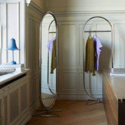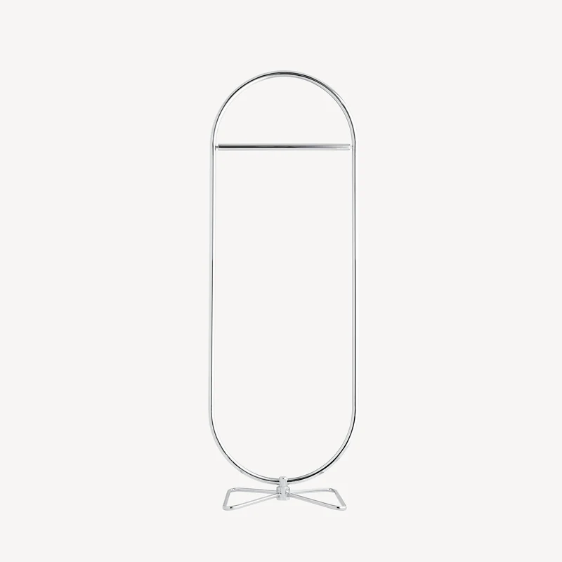 Sharing features with the System 1-2-3 chairs, the System 1-2-3 Rack is an elegant element for the wardrobe, bathroom or wherever there is a need for a stylish coat rack. The design use an oval chrome plated frame with a coat rack. The System 1-2-3 Rack sits on a butterfly base with swivel function.
