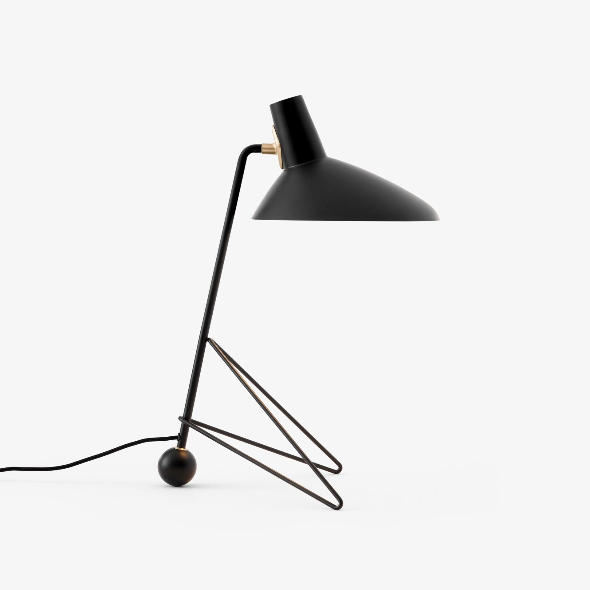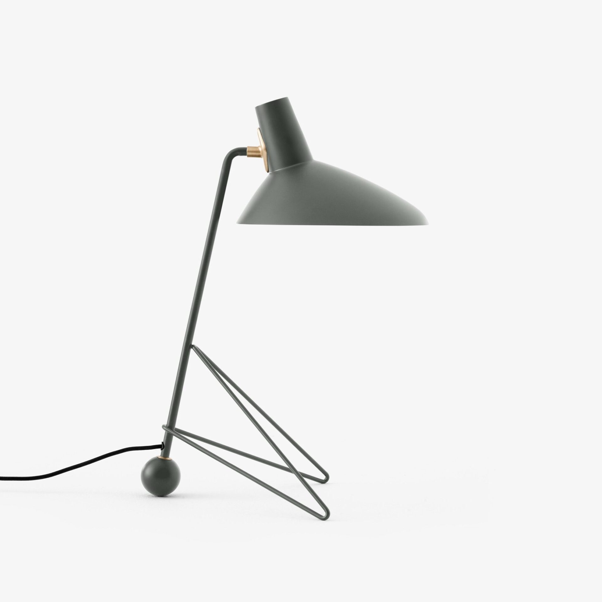 After the success of its floor lamp, &Tradition has expanded the Tripod series to include a table lamp with the same timeless design. Tripod, a table lamp built from powder-coated steel with brass details, reflects the clean minimalism of historic Copenhagen-based duo Hvidt & Mølgaard. Considered Old Masters of mid-century Danish design, their pieces often lend a sculptural element to the spaces they inhabit. This scaled-down table lamp version is available in three colours: Black, Maroon, and Moss.